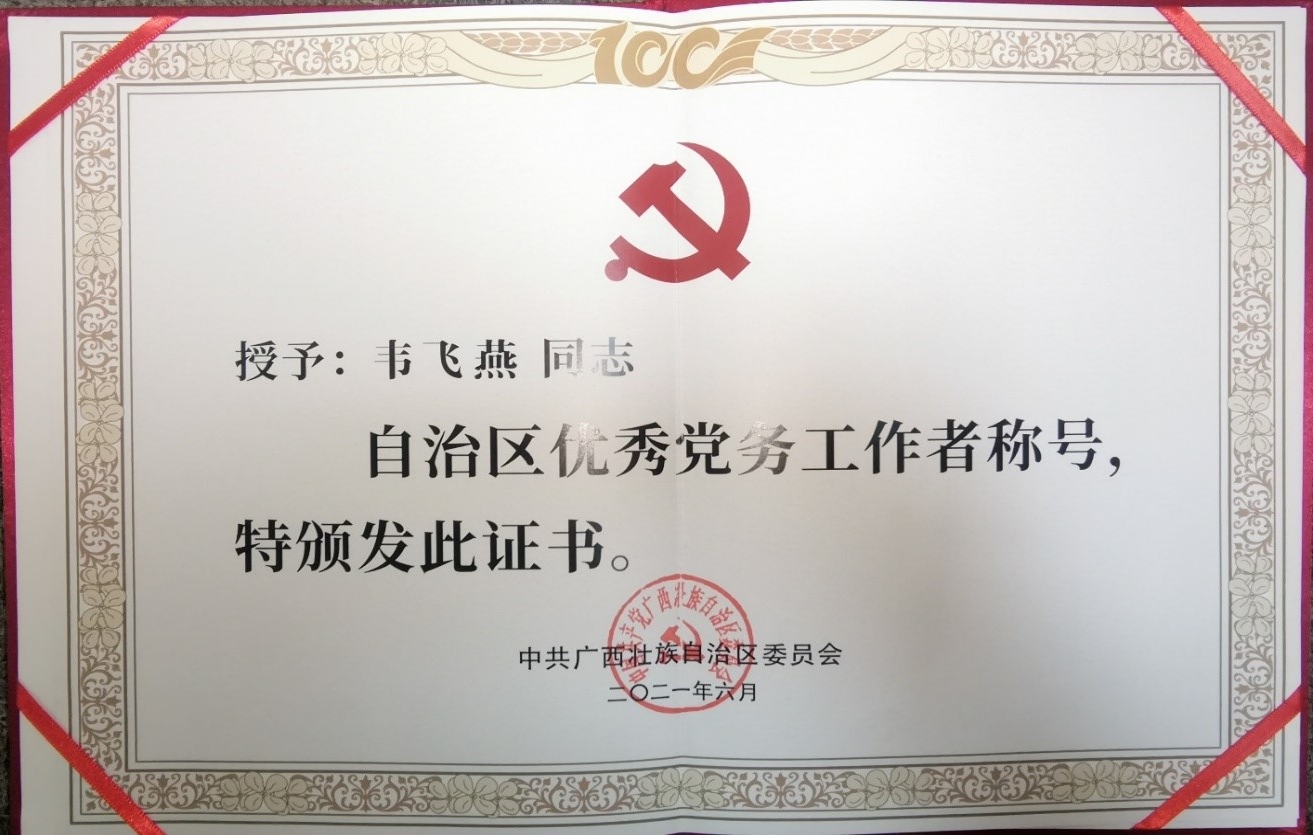 2021/06:亚洲色吧 党总支书记、董事长韦飞燕荣获“自治区优秀党务工作者”称号。