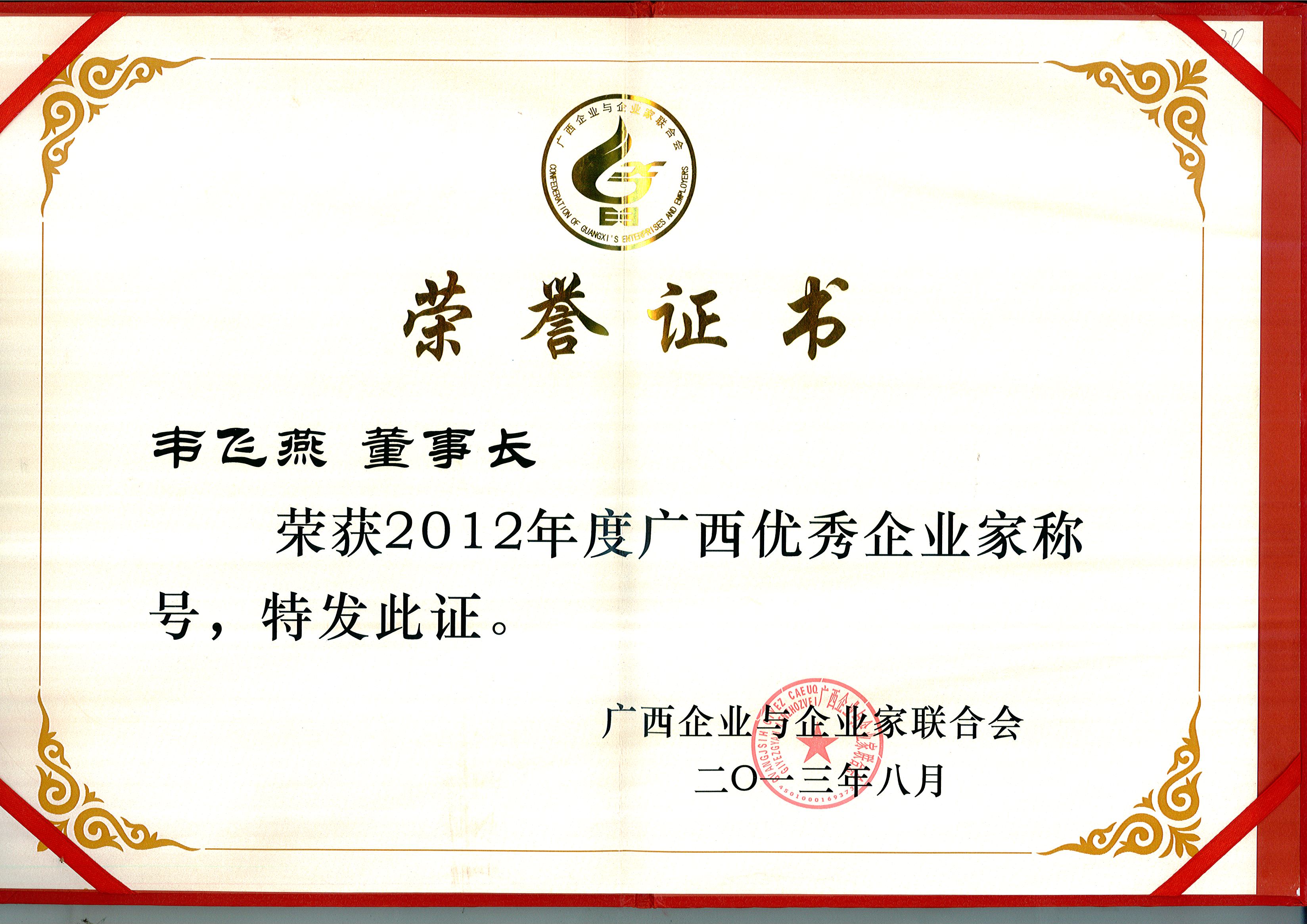 2013/08:韦飞燕董事长荣获“2012年度广西优秀企业家”称号。