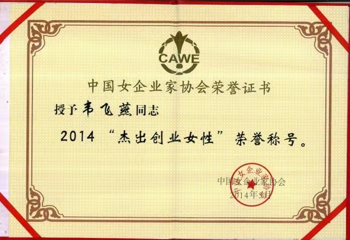 2014/03:韦飞燕董事长荣获“国家2014杰出创业女性”称号。