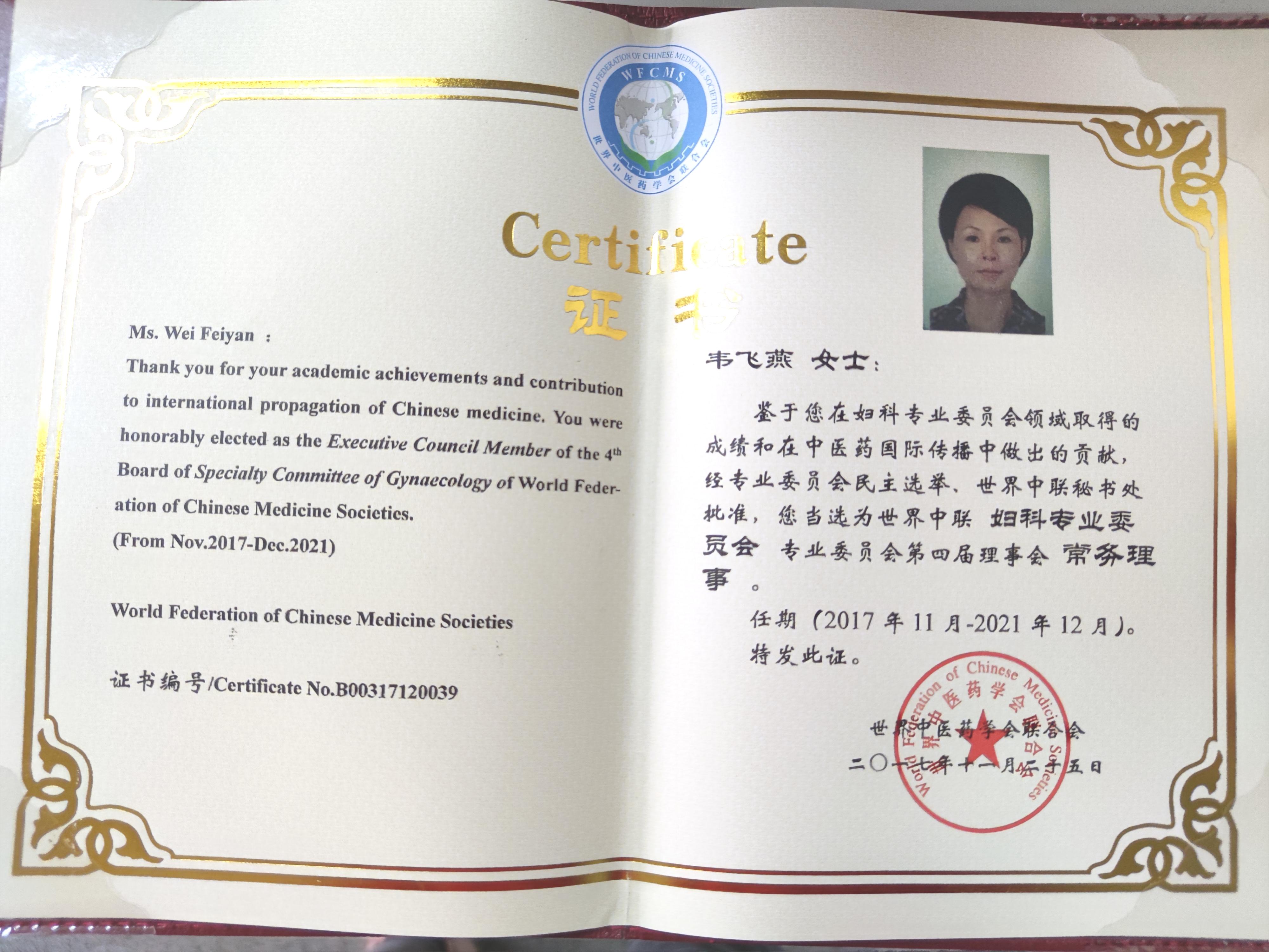2017/08:韦飞燕董事长当选为世界中联妇科专业委员会第四届理事会常务理事。