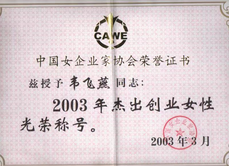 2003/03:韦飞燕总经理获评“2003年杰出创业女性光荣称号”。