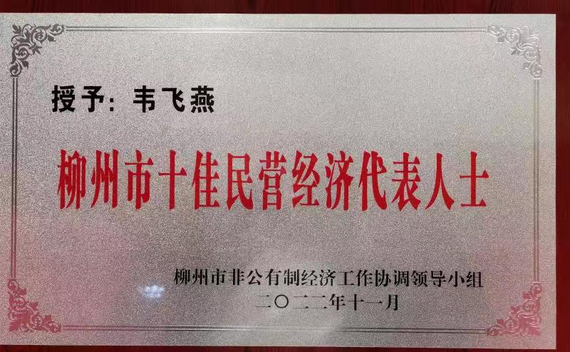 2020/10:韦飞燕董事长荣获柳州市“十佳民营企业代表人士”荣誉称号。