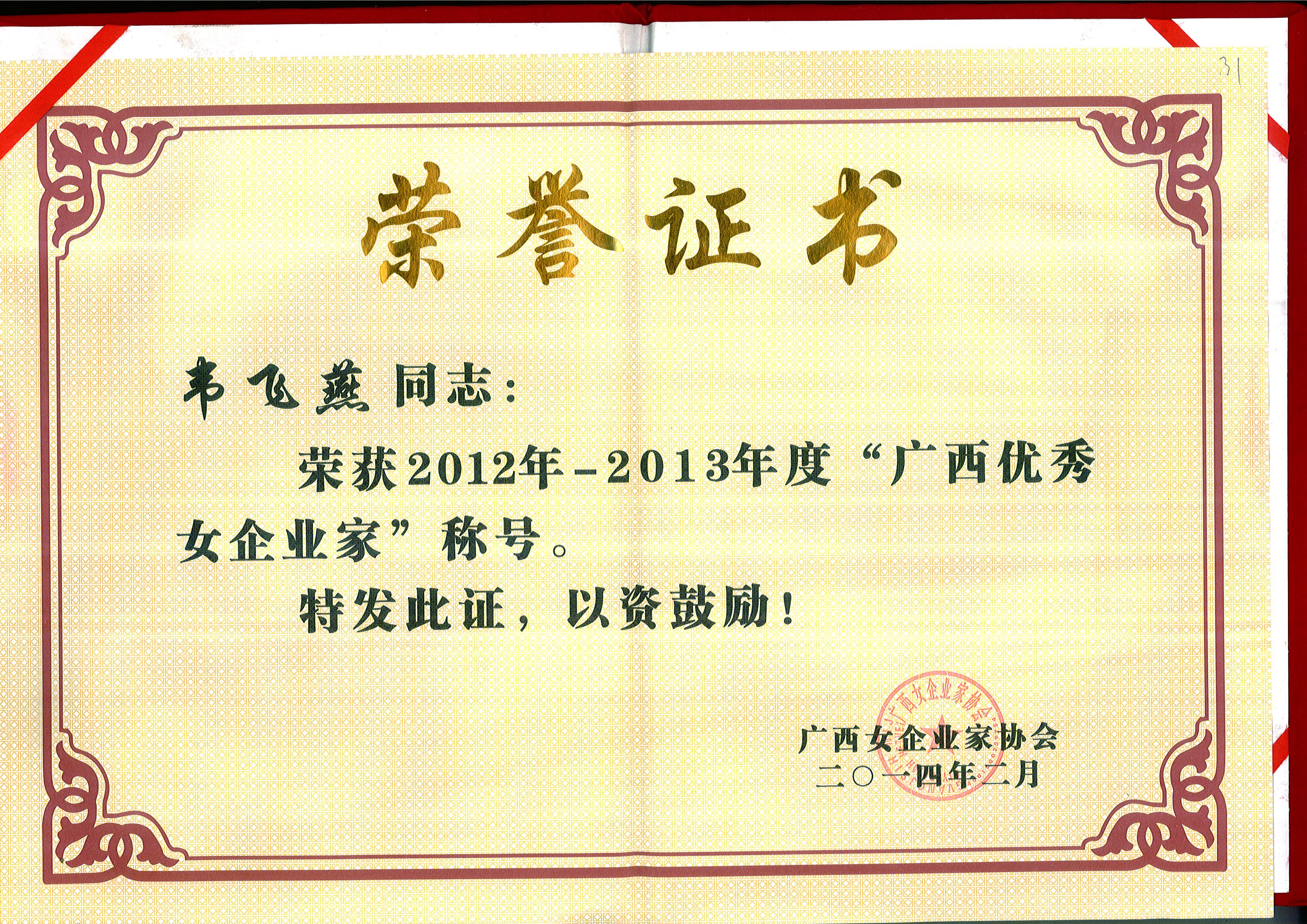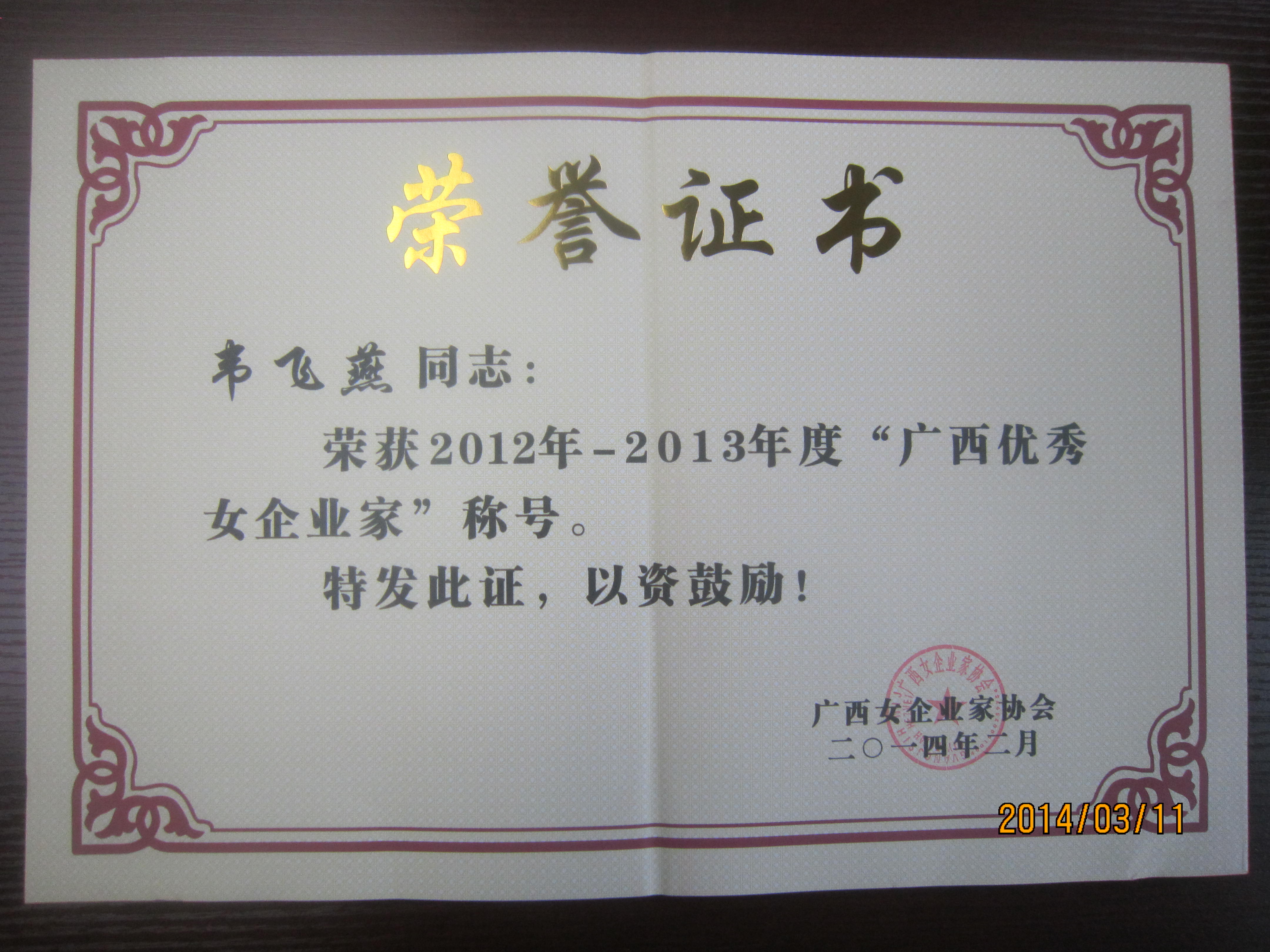 2014/02:韦飞燕董事长荣获“2012~2013年度广西优秀女企业家”称号。