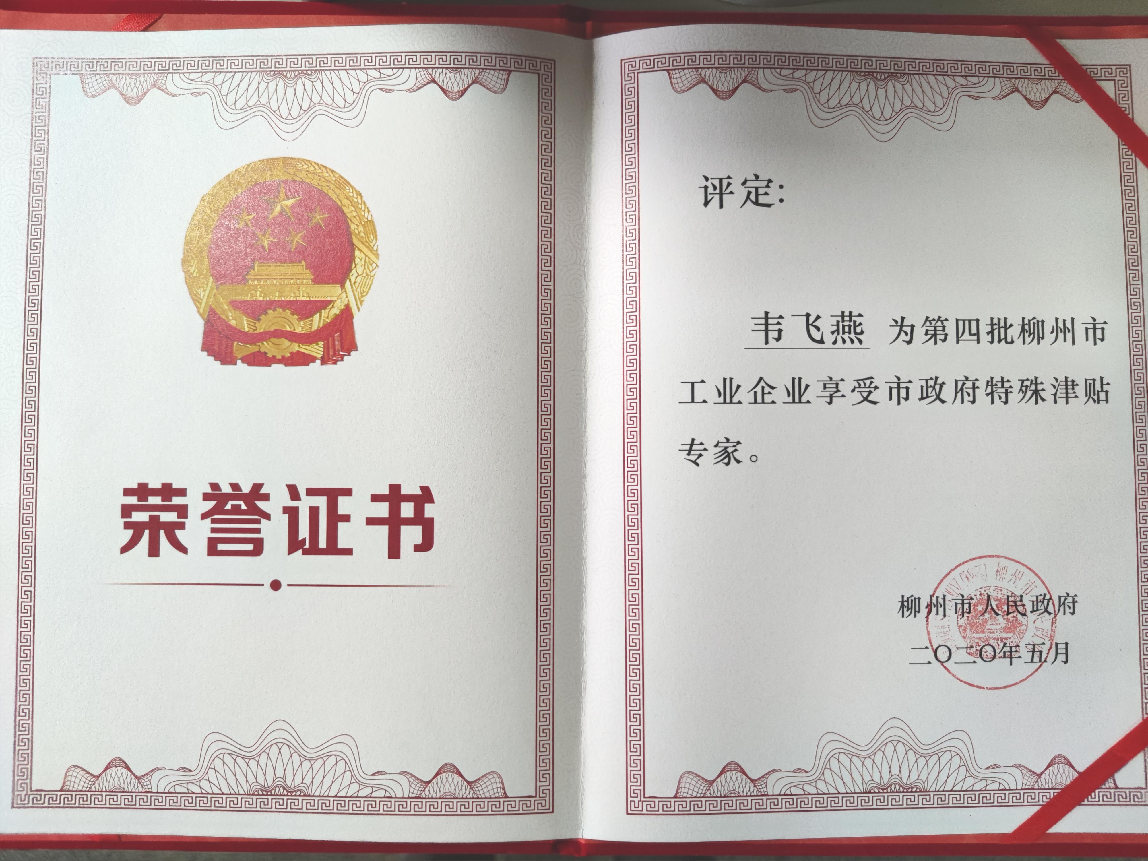 2019/06:董事长韦飞燕、生产技术总监张艳华成为“享受柳州市政府特殊津贴专家”。
