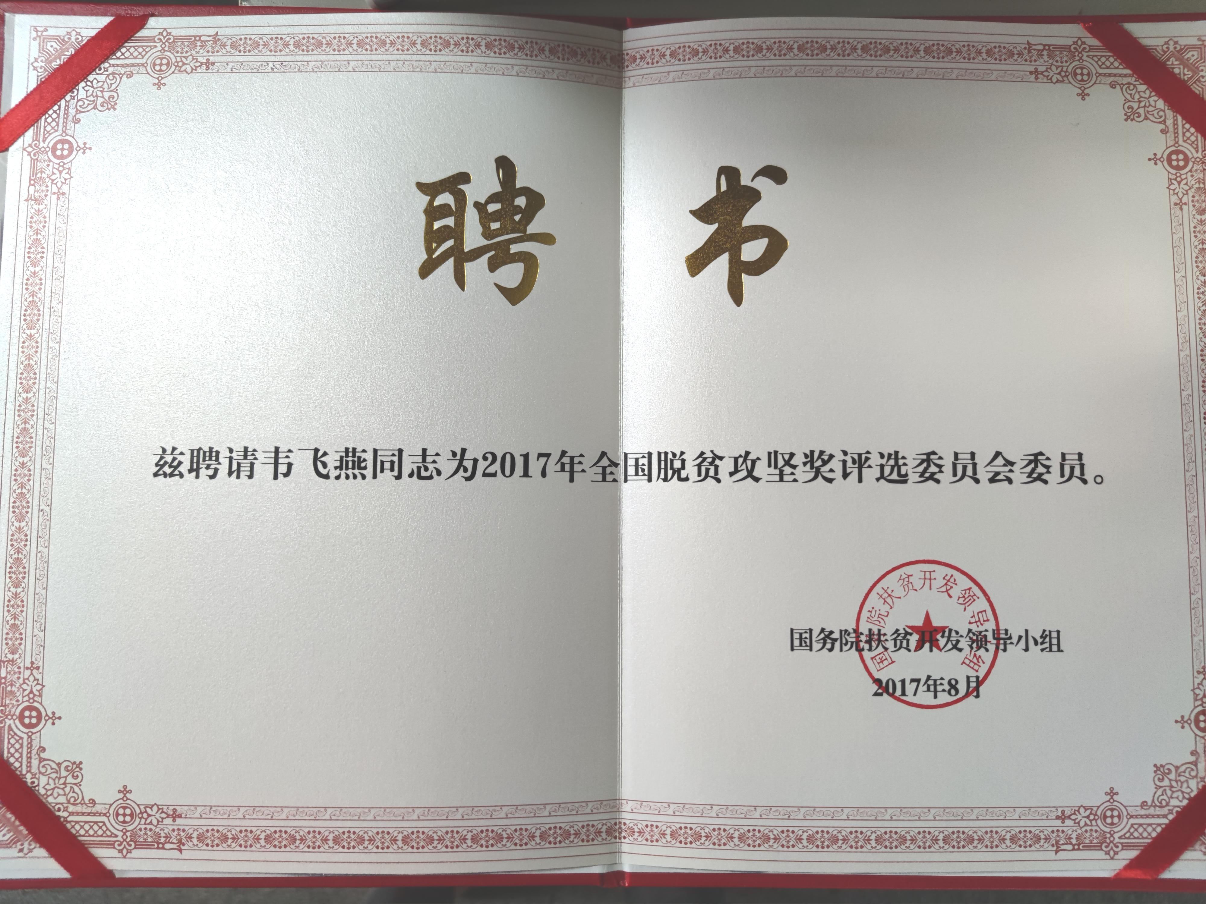 2017/08:韦飞燕董事长荣任2017年全国脱贫攻坚奖评选委员会委员;