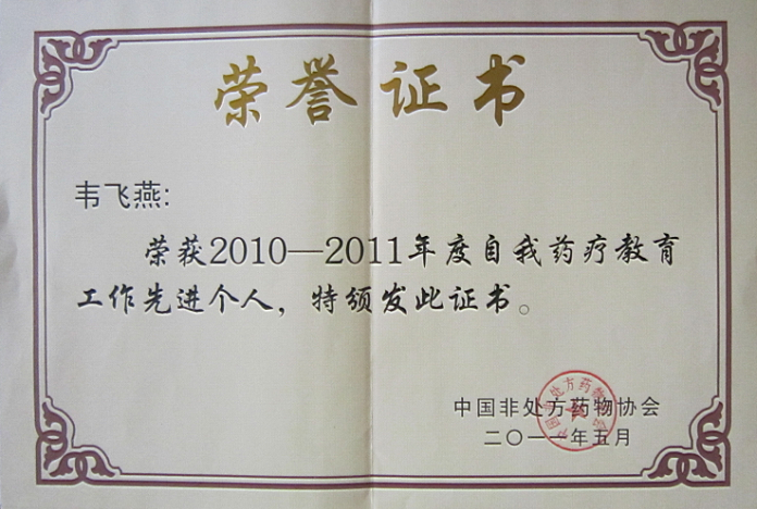 2011/05:韦飞燕董事长被中国非处方药物协会(CNMA)评为“2010-2011年度自我药疗教育工作先进个人”。