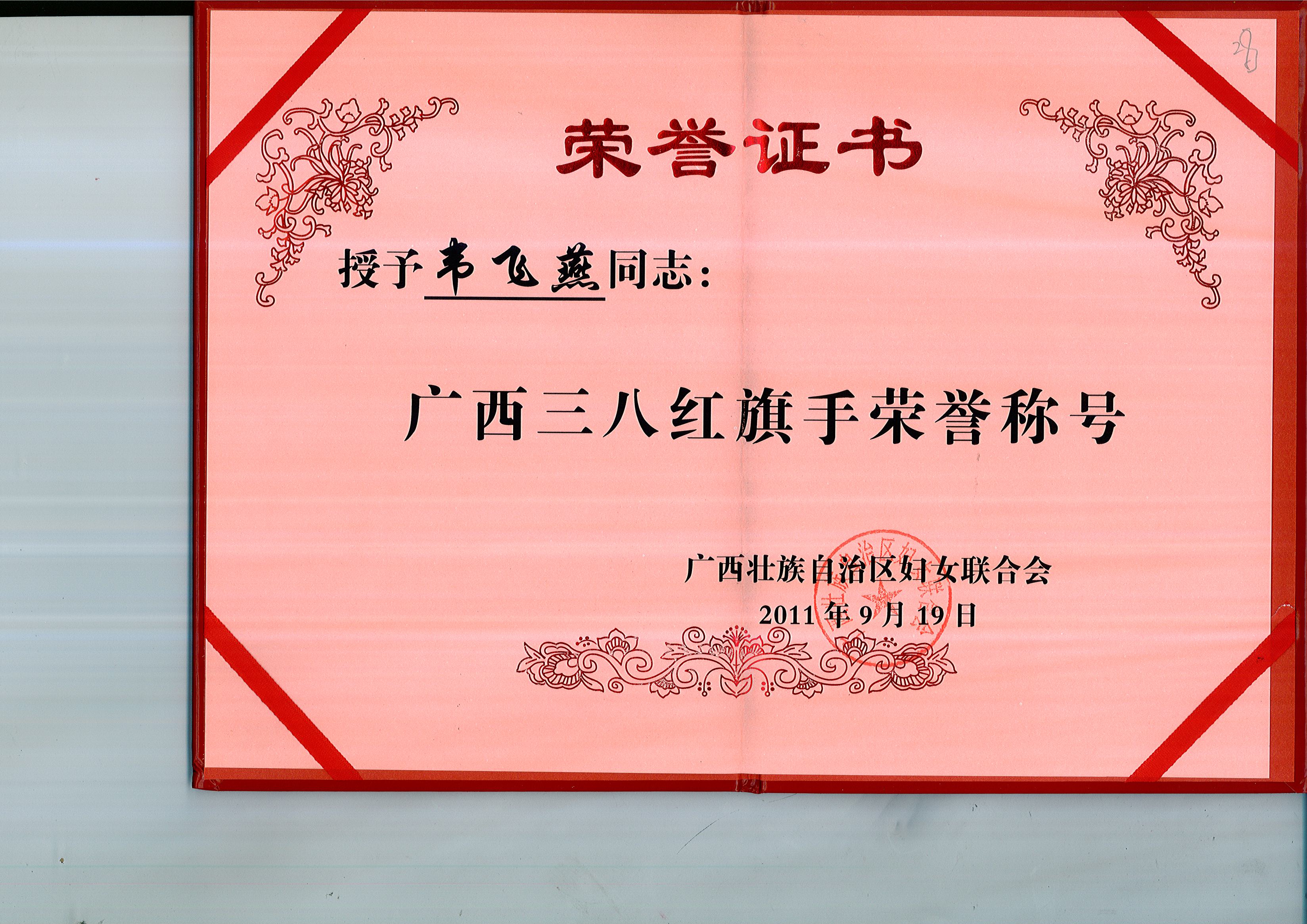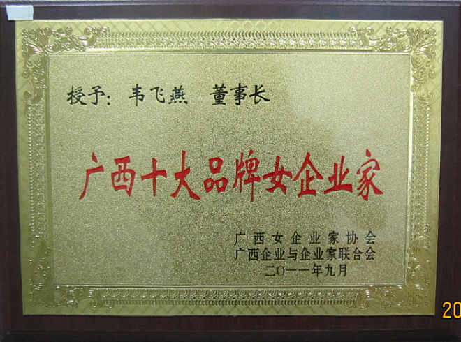 2011/09:韦飞燕董事长喜获“广西十大品牌女企业家”、“三八红旗手”两项荣誉称号。