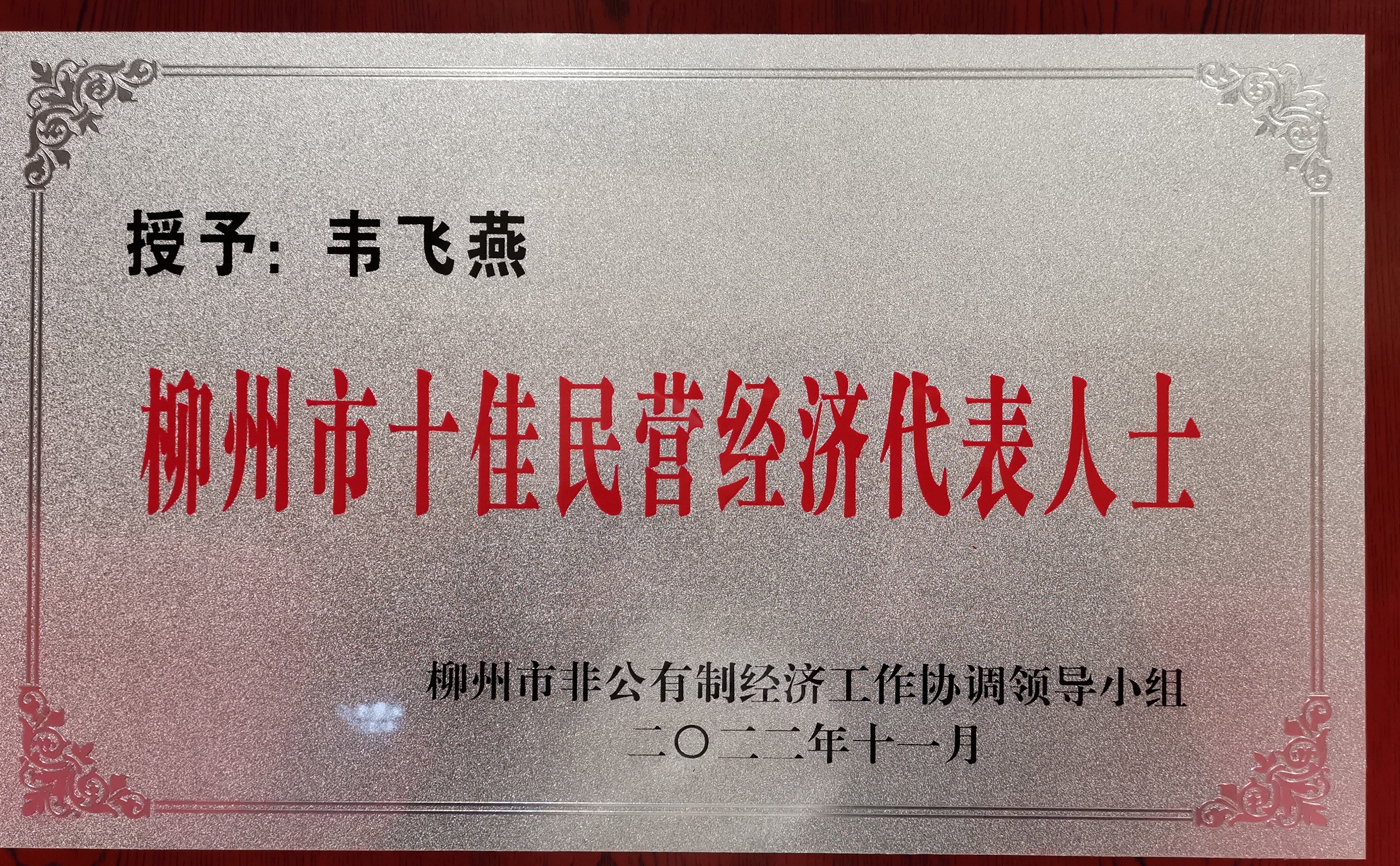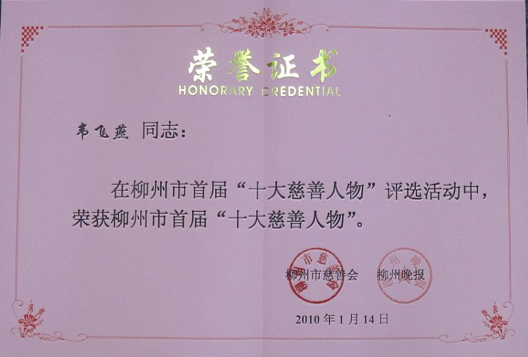 2010:韦飞燕董事长当选柳州市首届“十大慈善人物”。