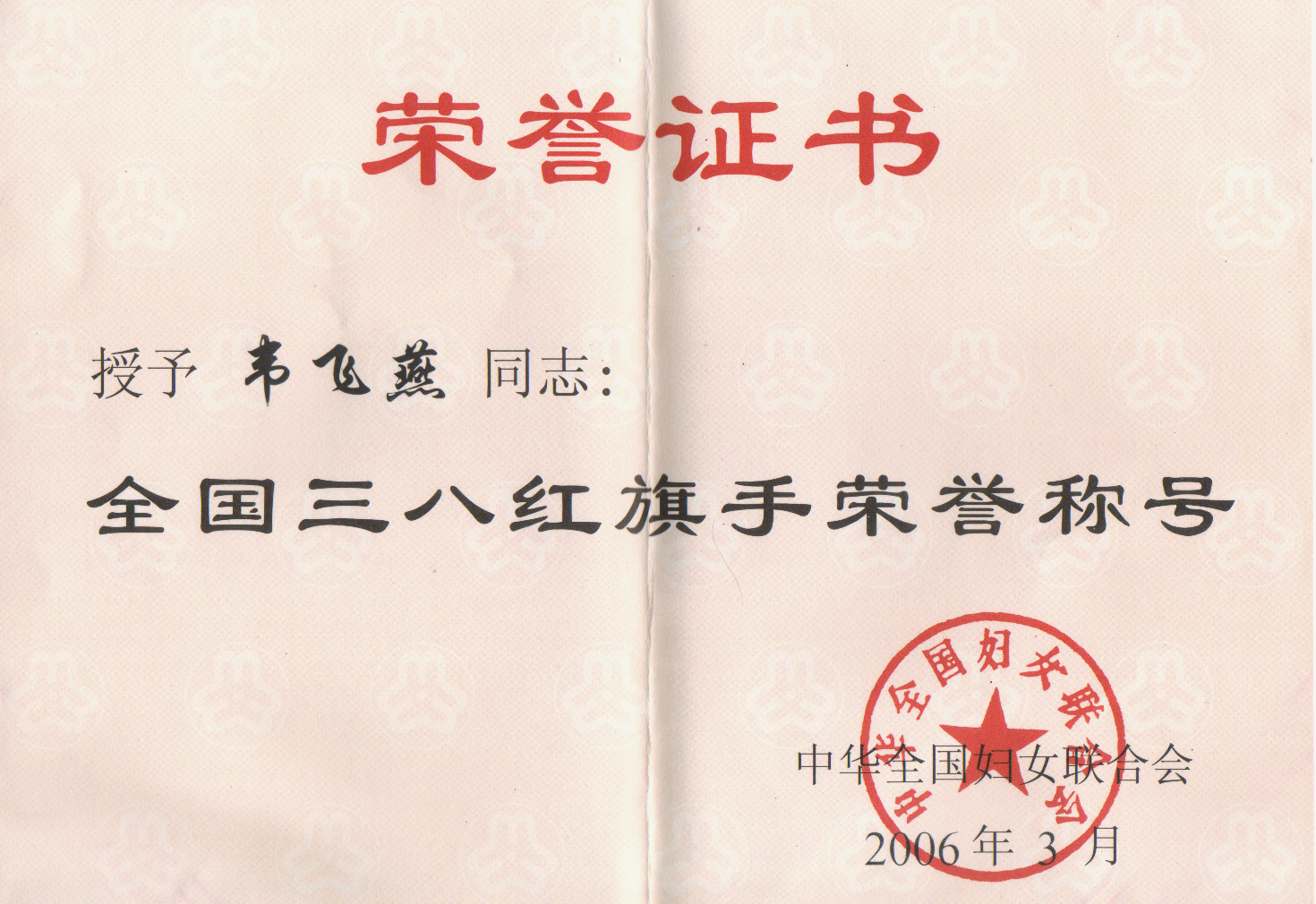 2006/03:花红药业股份有限亚洲色吧董事长韦飞燕获“2005年度全国三八红旗手”殊荣。