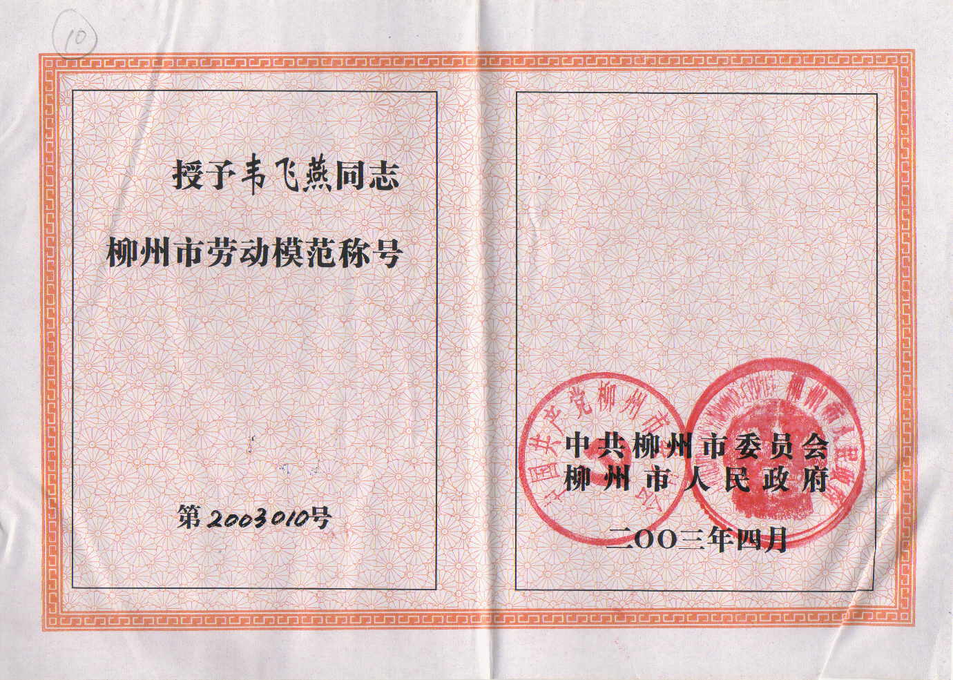 2003/04:韦飞燕总经理获得“柳州市劳动模范”称号。
