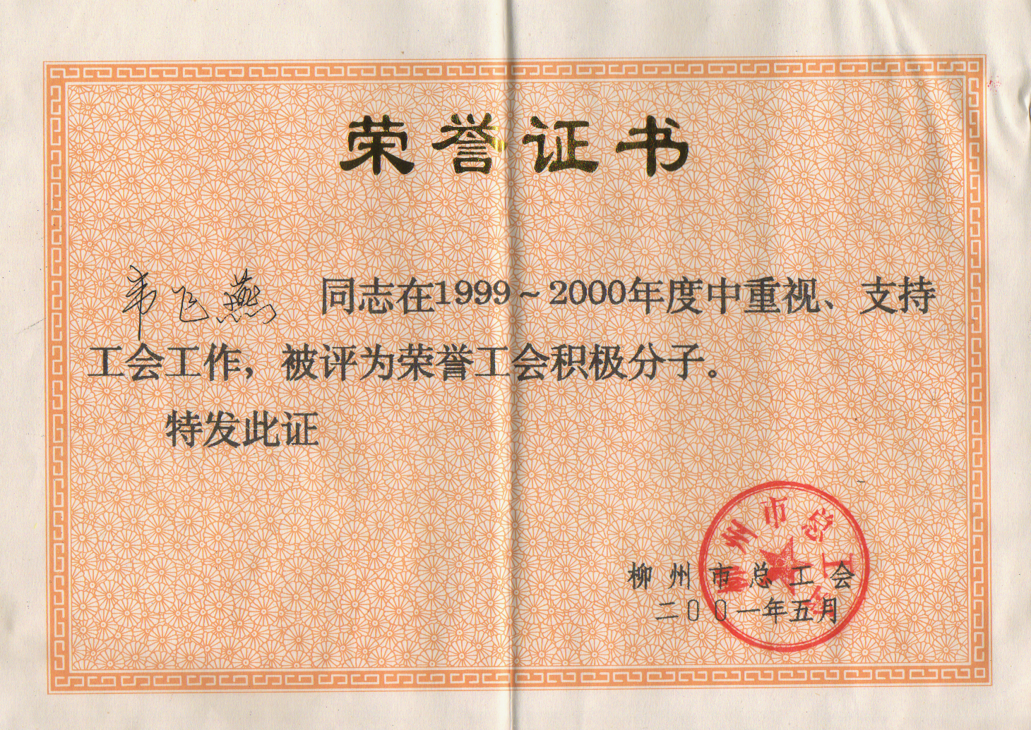 2000/05:韦飞燕厂长被评为“荣誉工会积极分子”。