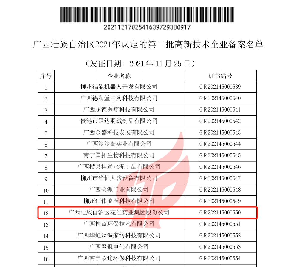 2021/12 :12月22日,花红药业再获国家“高新技术企业”称号。