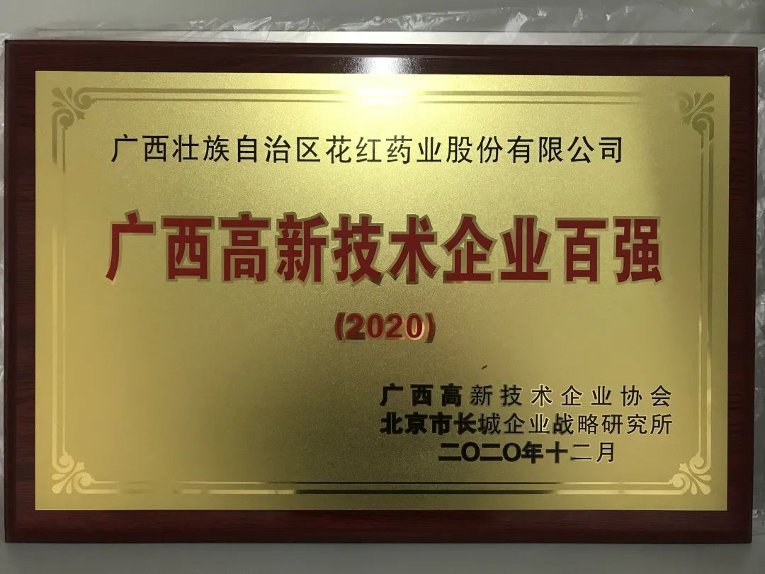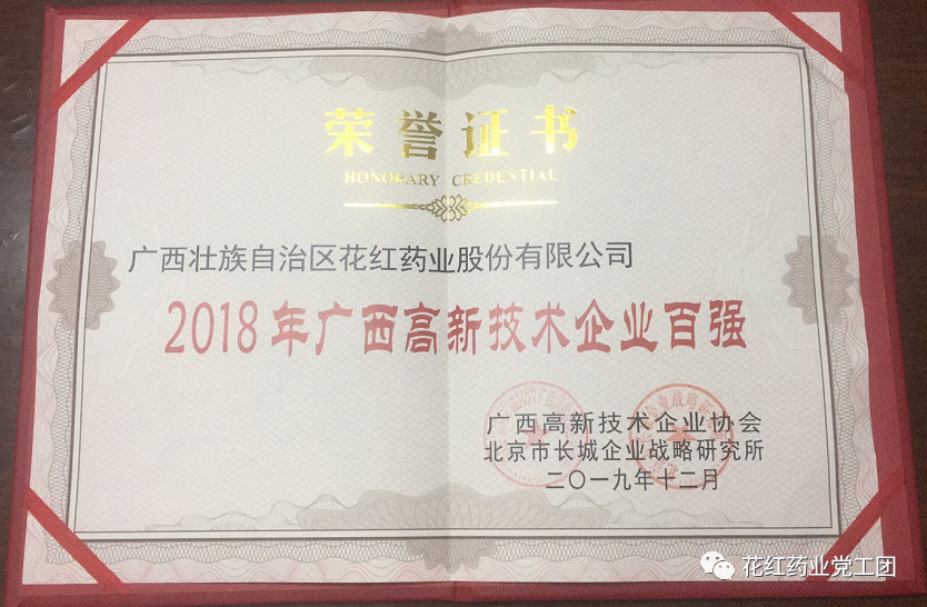 2019/12:12月24日,花红药业荣获“2018年广西高新技术企业百强”称号。