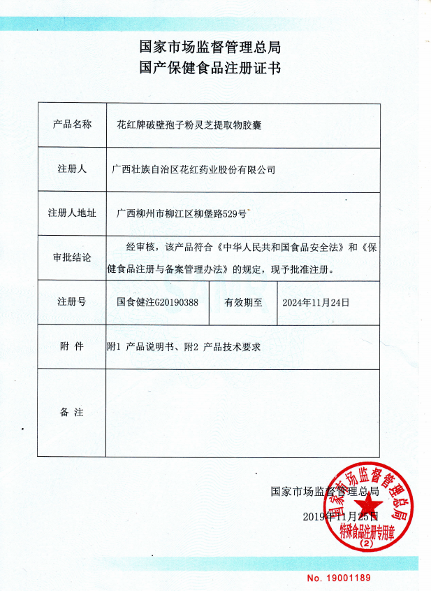 2020/01:“花红牌破壁孢子粉灵芝提取物胶囊”获得国产保健食品注册证书。