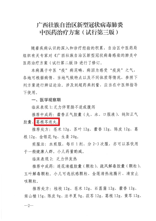 2021/08:8月13日,葛根芩连丸入选《广西壮族自治区2021年新型冠状病毒肺炎中医药预防方案(试行)》。