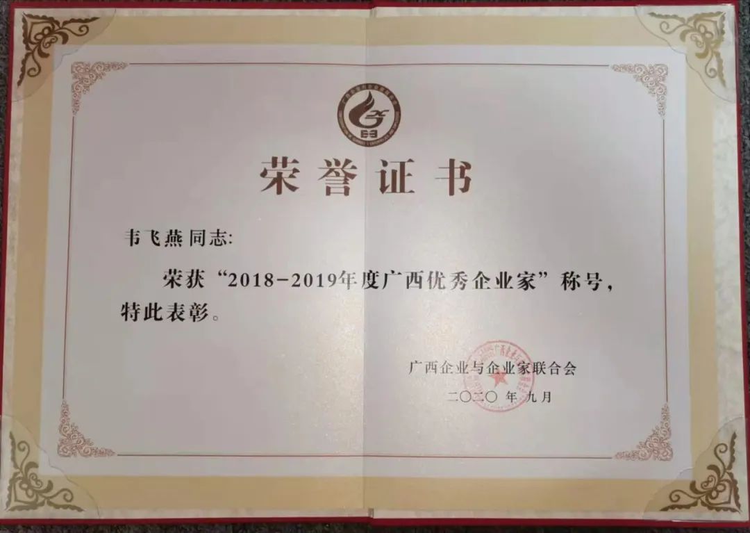 2020/07:7月21日,花红药业董事长韦飞燕荣获第五届广西“优秀中国特色社会主义事业建设者”称号。